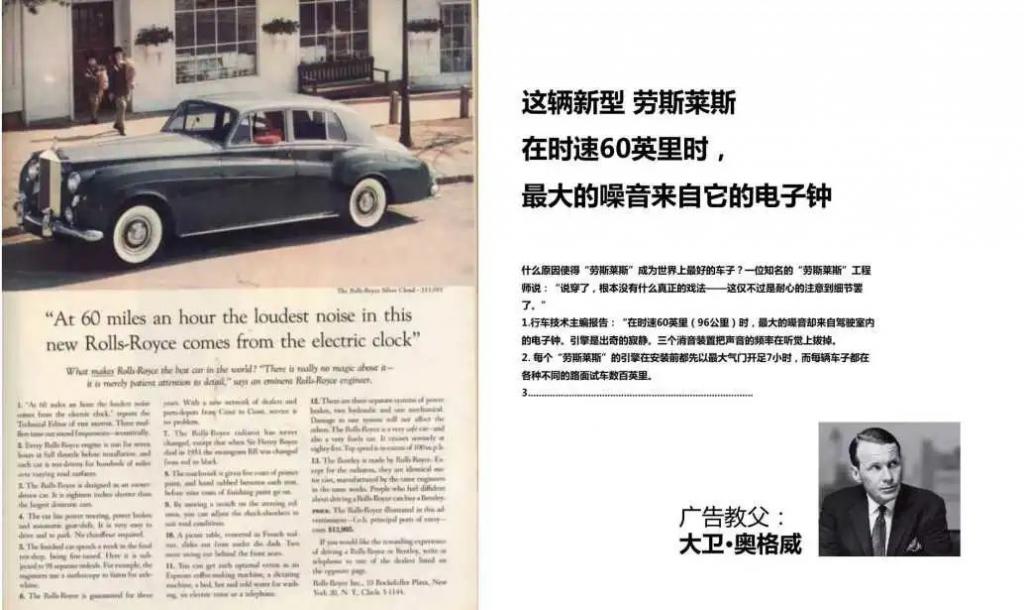这辆新型劳斯莱斯,在时速 60 英里时,最大的噪音来自它的电子钟 "