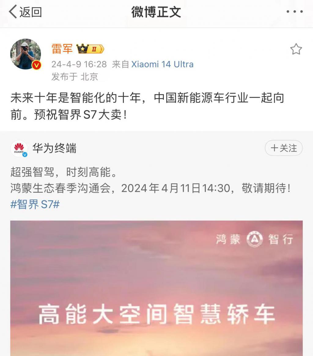 华为和小米颠覆了汽车营销的格局,利用流量转化销量让车企见识到了 " 新大陆 ",但看不懂和学不会,使得车企更急于追寻流量而不择手段,忽略了大品牌该有的格局。如果真的羡慕互联网品牌的流量操盘,不如学习一下雷军的格局,他今天发微博推文,祝智界 S7 大卖,冲这个相互祝福的谦逊,雷军在车圈显然更吃得开。