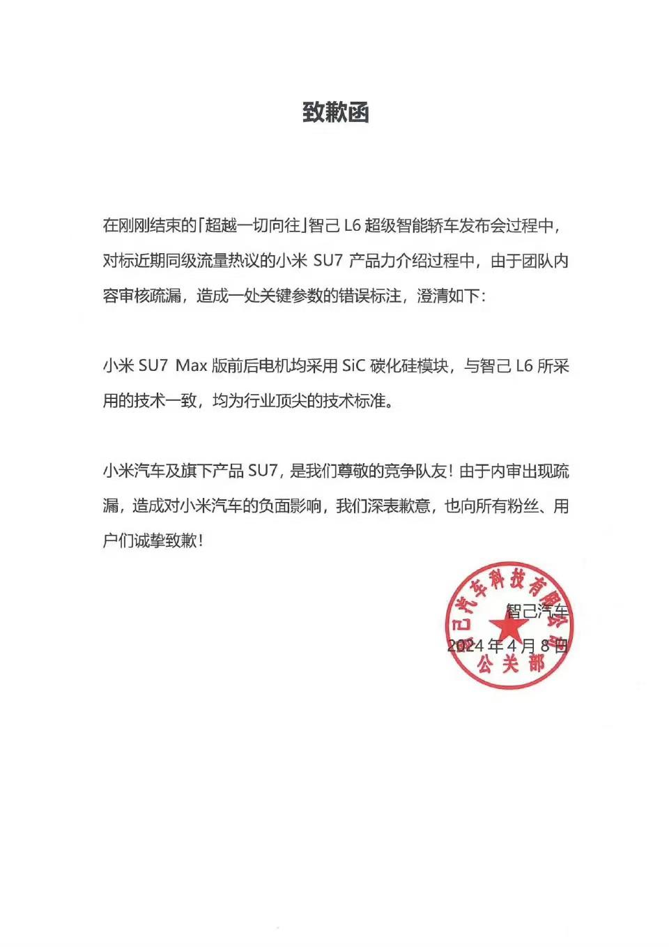 这还仅仅是智己汽车大瓜的开始,当晚因为发布会 PPT 错误标注小米 SU7 参数,智己汽车遭到小米官方 " 三连讨伐 ",敦促智己公开澄清道歉。