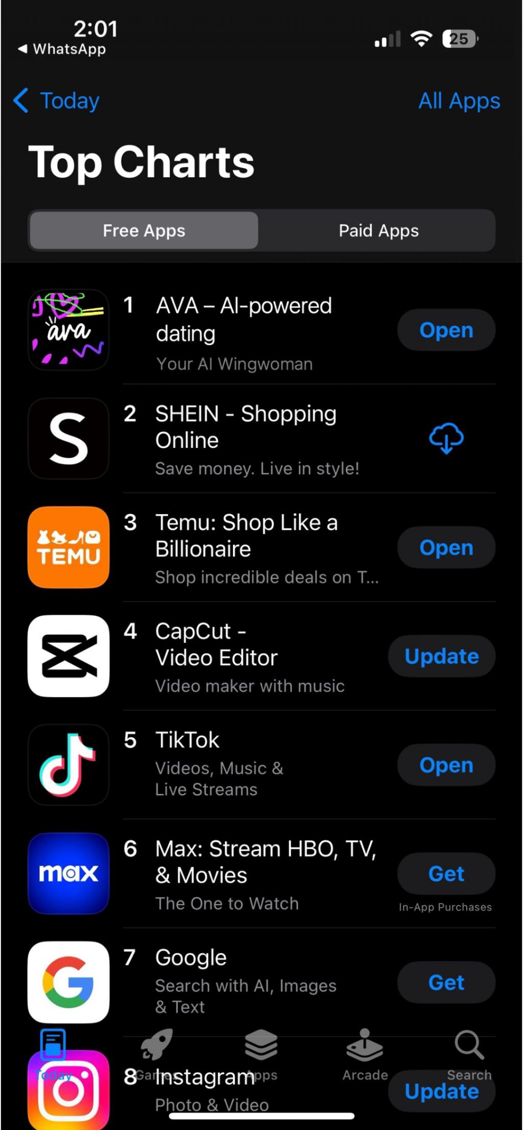 2024 年 4 月 1 日,一款名为 Ava 的 AI Dating 产品登上美国免费下载榜总榜 Top1。