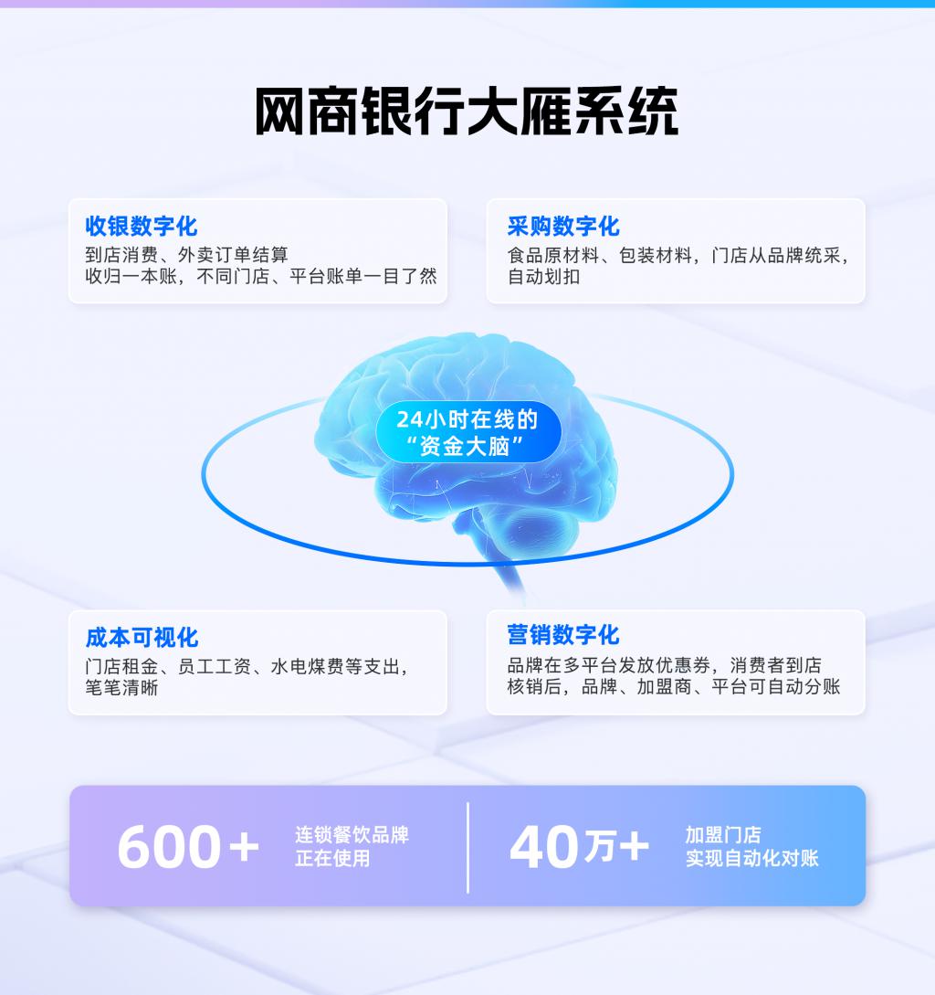 网商银行大雁系统为连锁加盟品牌提供 24 小时在线的智能 " 资金大脑 ",让所有门店实现从收银、支付结算到多平台经营的全链路数字化,支持品牌经营提效。