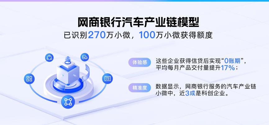在汽车产业链上,网商银行大雁系统已经为超过 100 万小微企业提供信贷额度。获得金融服务的用户中,64% 首次获得纯信用贷款。