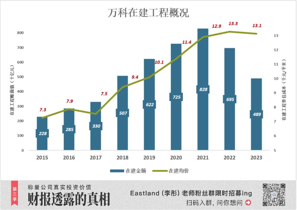 2022 年末、2023 年末,在建工程单位成本分别为 1.33 万元 / 平米、1.31 万元 / 平米。分别相当于本财年合约销售均价的 83.7%、86.1%(2015 年 -2019 年,这个比例不到 70%)。