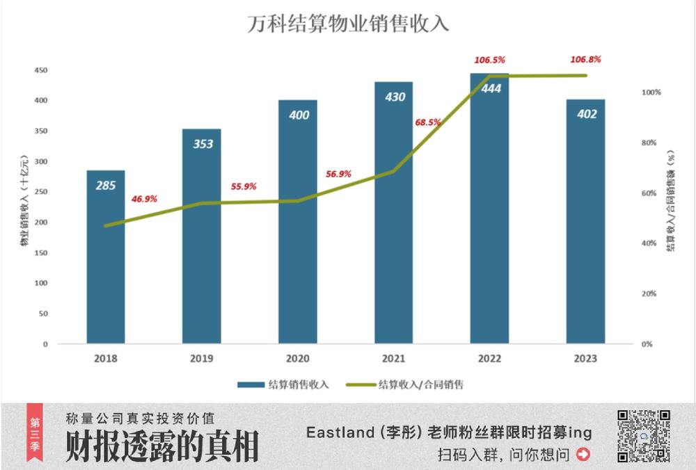 2023 年,合同销售 3761.2 亿、结算 4016 亿,相当于合同销售额的 106.8%。万科被迫开始 " 抽水 "。