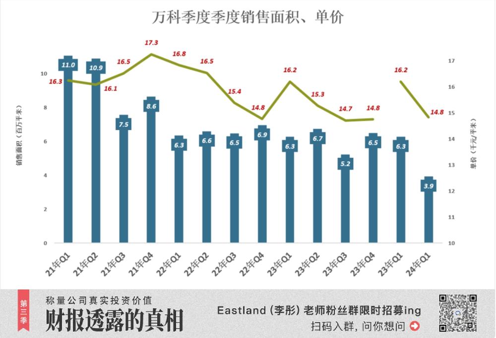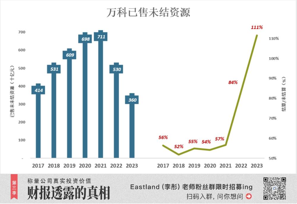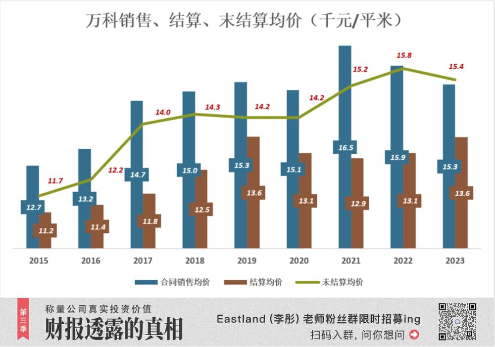 结算的对象是以往的合同销售,但万科近年的结算均价明显偏低。以 2023 年为例,结算均价 ( 1.36 万元 / 平米 ) 比 2022 年合同销售均价低 14.5%,比 2021 年销售均价低 17.7%,比 2020 年销售均价低 10.1% ……
