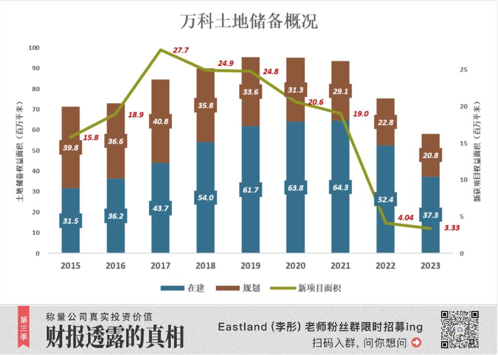 2022 年,万科新增项目权益面积锐减至 404 万平米,年末土地储备降至 7520 万平米;