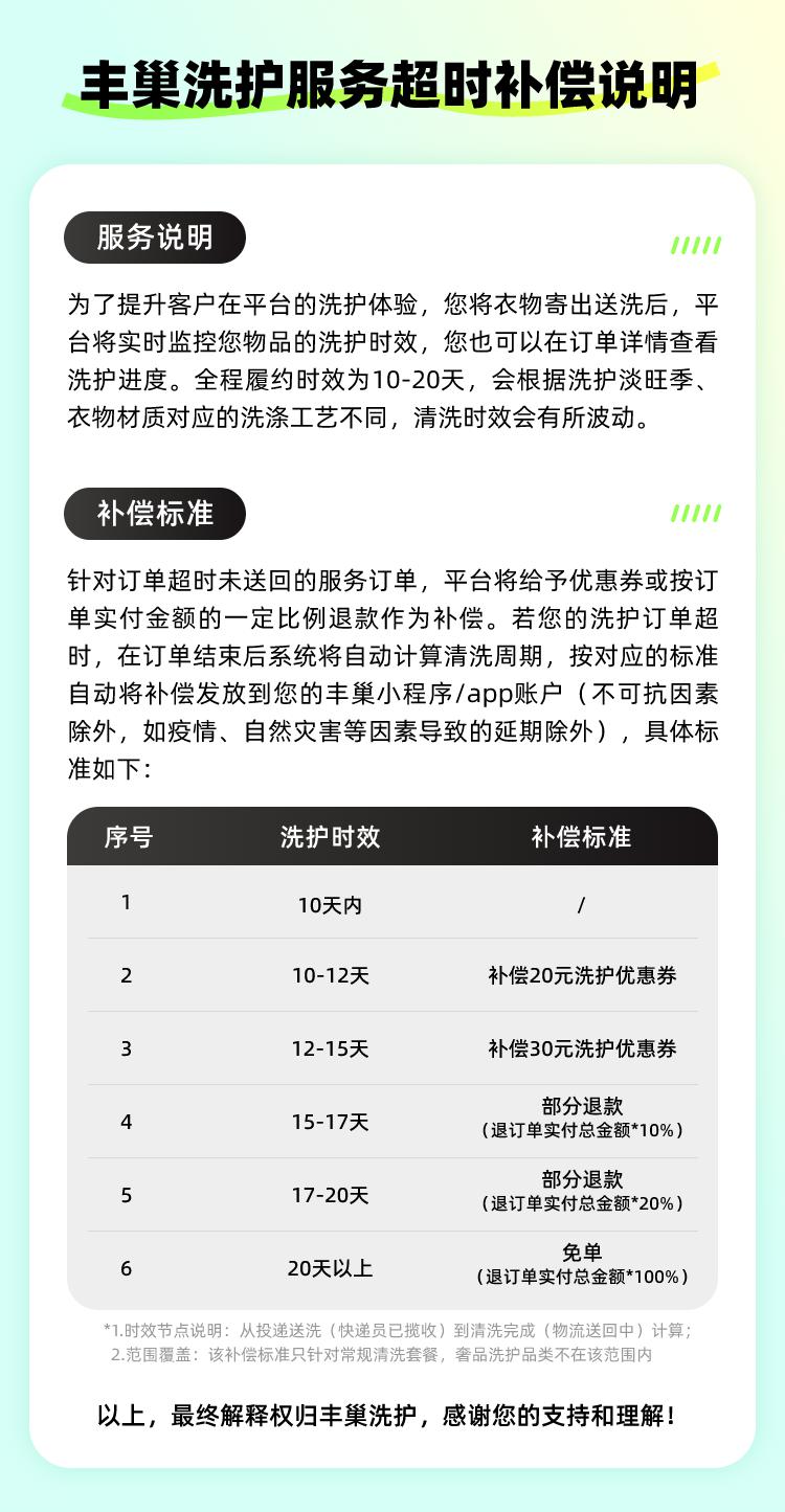 为了进一步了解丰巢洗护时效的问题,4 月 12 日,记者咨询了丰巢的人工客服,对方发来了一张丰巢洗护服务超时补偿说明的海报,上面显示 " 全程履约时效为 5-10 天,会根据洗护淡季(6-9 月)、旺季(10- 次年 5 月)、衣物材质对应的洗涤工艺不同,清洗时效会有所波动。"