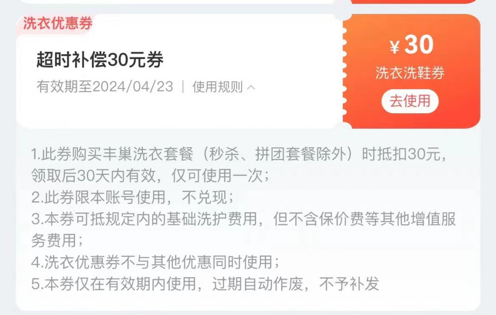 " 之前在线下的店洗衣,3 天就拿回来了,没想到尝鲜试了回线上,要等 10 天。" 马先生向记者补充提到,由于订单超时,其账户被补偿了一张 "30 元洗护优惠券 ",但 " 食之无味,弃之可惜 ",由于不能用于拼团、秒杀的订单,相当于购买原本的优惠套餐和使用补偿券后的费用大差不差,而且有效期仅 30 天。