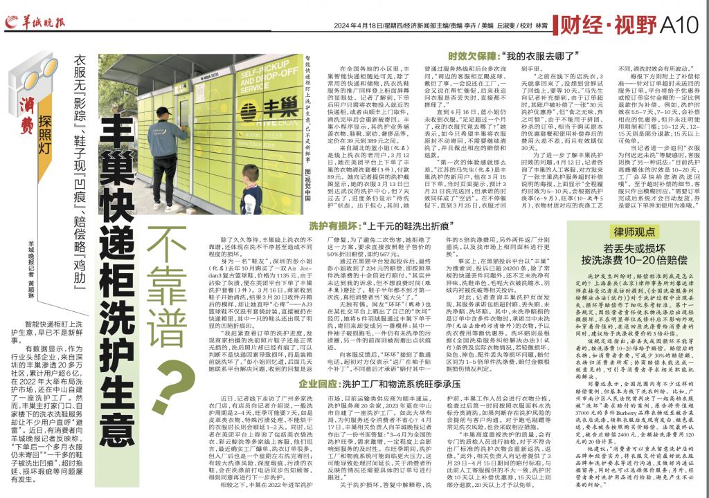 4 月 17 日,丰巢相关负责人向羊城晚报记者作出了一份书面答复:"3-4 月为全国的洗护旺季,需求激增,一定程度上会影响到服务的及时性。在旺季期间,洗护工厂和物流系统可能面临更大压力,这可能导致处理时间延长,关于消费者所反映的情况还需要具体的订单号进行跟进。"