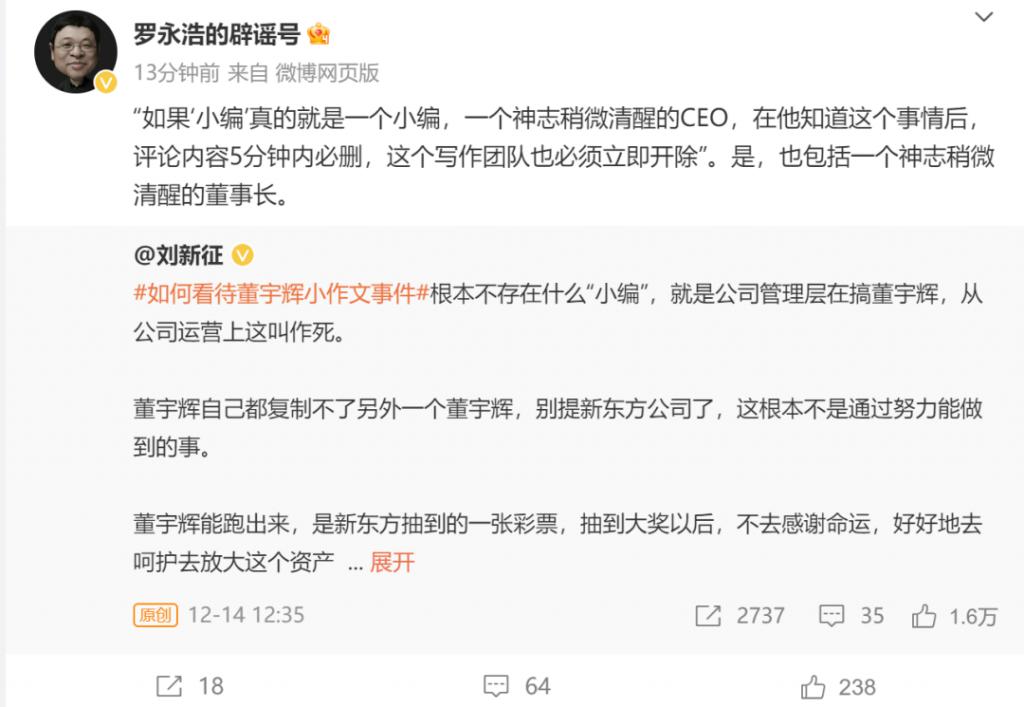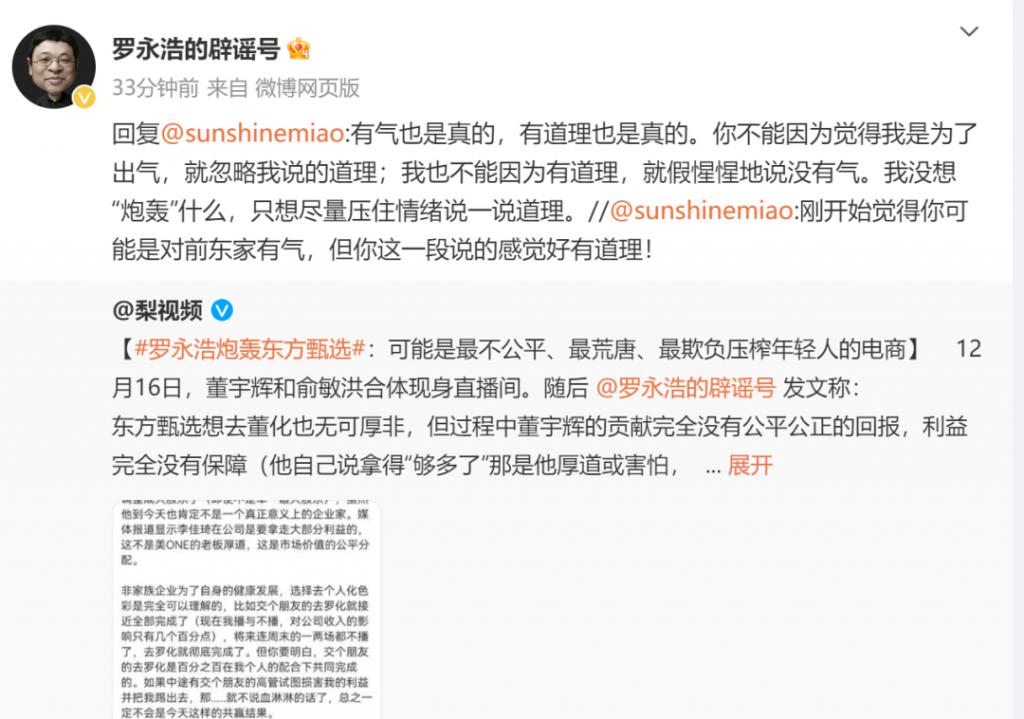 12 月 16 日晚间,俞敏洪与董宇辉合体直播。罗永浩连发 2 篇文吐槽,他表示," 东方甄选可能是直播电商在中国诞生后,我见过的最不公平、最荒唐、最欺负压榨年轻人的现象级公司。"