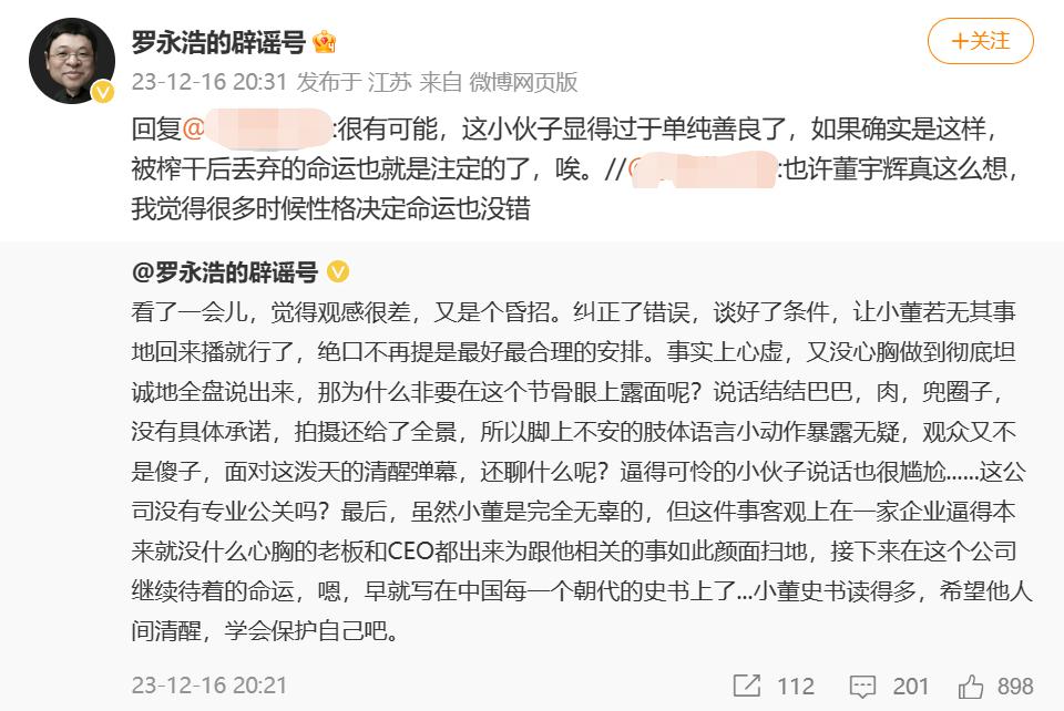 有网友表示," 也许董宇辉真这么想,我觉得很多时候性格决定命运也没错 ",罗永浩回复称," 很有可能,这小伙子显得过于单纯善良了,如果确实是这样,被榨干后丢弃的命运也就是注定的了,唉。"