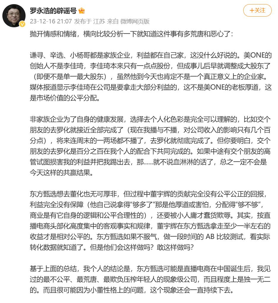非家族企业为了自身的健康发展,选择去个人化色彩是完全可以理解的,比如交个朋友的去罗化就接近全部完成了(现在我播与不播,对公司收入的影响只有几个百分点),将来连周末的一两场都不播了,去罗化就彻底完成了。但你要明白,交个朋友的去罗化是百分之百在我个人的配合下共同完成的。如果中途有交个朋友的高管试图损害我的利益并把我踢出去,那 ...... 就不说血淋淋的话了,总之一定不会是今天这样的共赢结果。