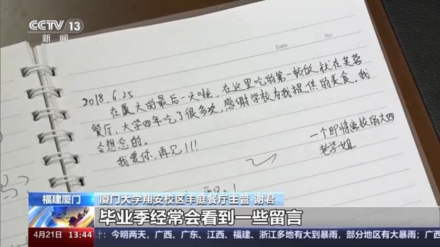 厦门大学翔安校区丰庭餐厅主管 谢君:毕业季经常会看到一些留言,有同学写说这是我在厦大的最后一天了,感谢食堂叔叔阿姨们把她养胖了,谢谢再见,我爱你们。看到这些我们就心里暖暖的,我们做的都是很平凡的小事,但是平凡的事重复做、坚持做,也可以成为有意义的事。