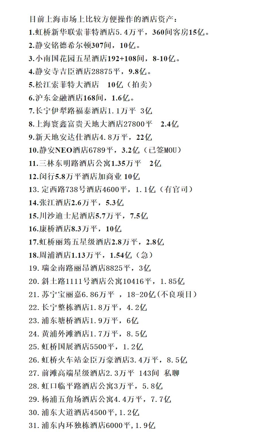 昨日,一份社交媒体上流传的上海最新待售酒店清单显示,仅 " 比较方便操作的酒店资产 " 就包括 31 家: