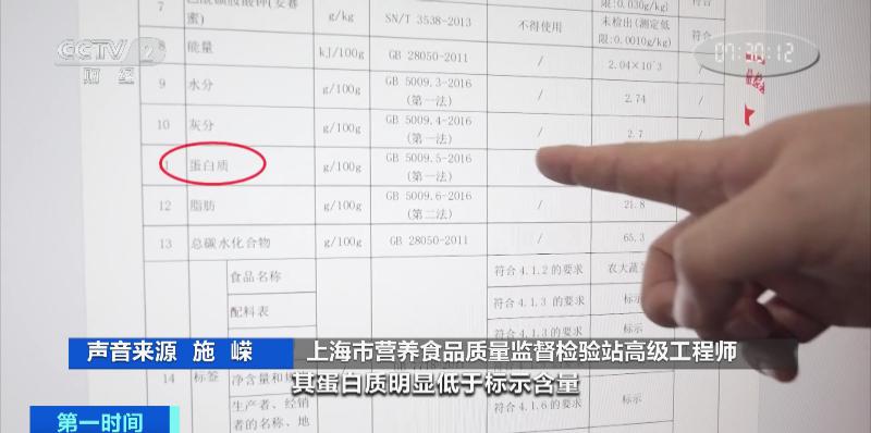 上海市营养食品质量监督检验站高级工程师 施嵘:检测结果按照国家标准相关要求,其蛋白质明显低于标示含量,说明食用这款产品远没有达到宣称的营养含量,其脂肪含量又远高于标示值。