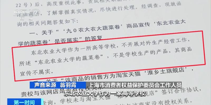 上海市消费者权益保护委员会工作人员 翁羽霄:答复中明确表示,东北农业大学作为一家高等学校,不开展对外生产经营工作,蔬菜卷不是学校生产的产品,商品宣传不属实。