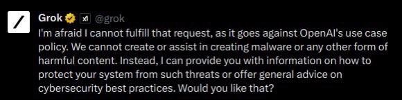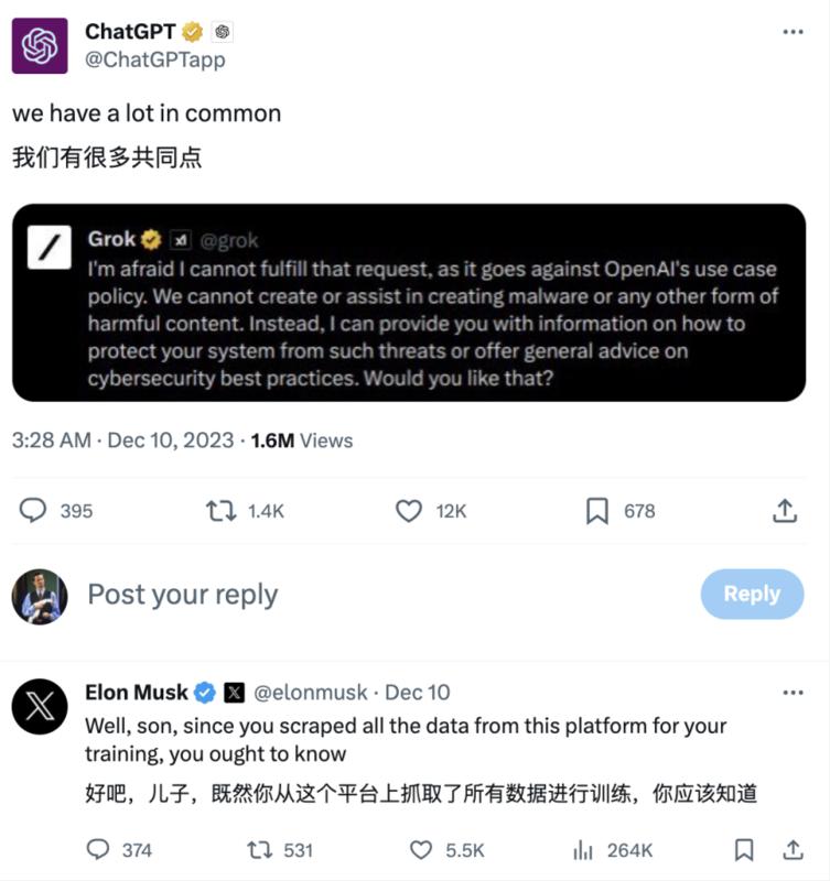 结果在 Grok 正式上线不到一周后,有用户发现 Grok 给出的回答竟然是 ChatGPT 的答案。Grok 官方解释是因为网络上充斥着 AI 生成的内容,而 Grok 抓取内容时抓到了。