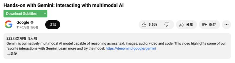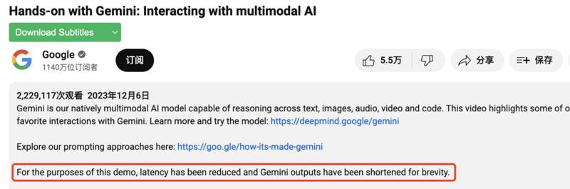 正如那难以发现的 " 最终解释权归商家所有 " 套路一样,谷歌也玩起了小伎俩。回看这段视频的时候我们发现,在简介部分,点开 " 更多 ",才会显示这样一句话:" 处于演示的目的,为了简洁起见,视频减少了 Gemini 生成内容时的延迟,其生成内容也被缩短。"
