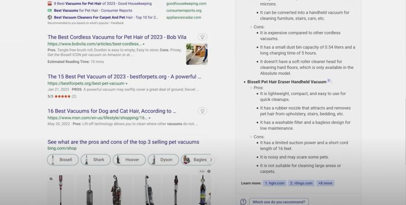 例如,发布会上展示搜索功能时,提问的内容是 " 请推荐宠物吸尘器 ",Bing 对销量最高的 3 个宠物吸尘器进行优缺点总结。