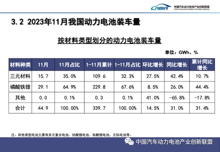 据中国汽车动力电池产业创新联盟最新数据显示,今年 11 月,我国动力电池装车量 44.9GWh。其中,三元电池装车量 15.7GWh,占总装车量 35.0%;磷酸铁锂电池装车量 29.1GWh,占总装车量 64.9%。