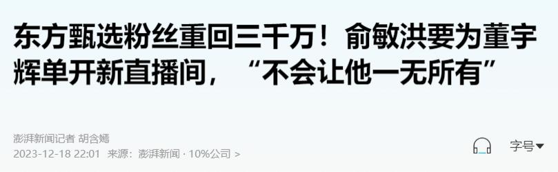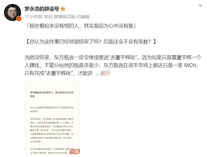 俞敏洪还表示,要为董宇辉单开新直播间,不会因为升职就不再继续直播带货了。