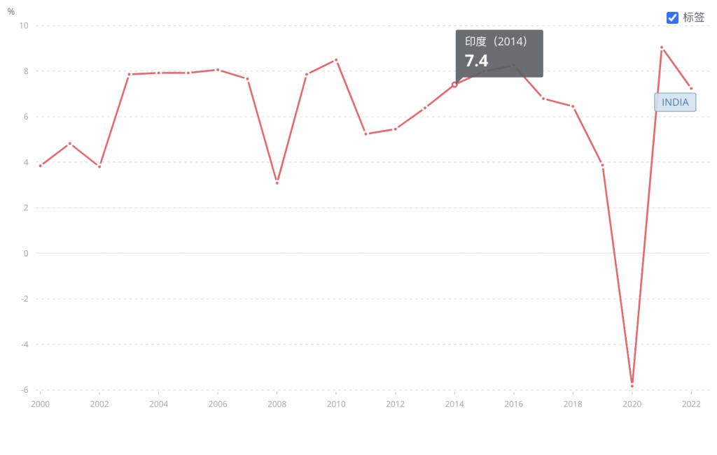 世界银行的数据显示,在他上台前的 2004 年至 2013 年,印度 GDP 的复合年增长率平均为 6.8%。而莫迪上台后的 2014 年至 2022 年间,印度的 GDP 复合年增长率平均为 5.6%。