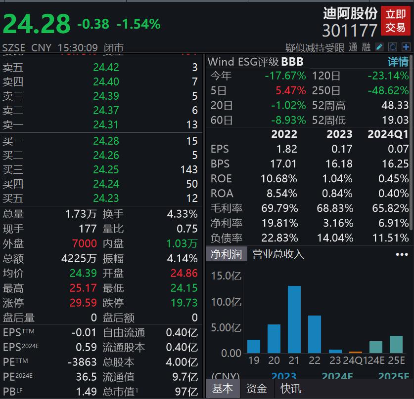 二级市场上,截至 4 月 30 日收盘,迪阿股份跌 1.54%,报 24.28 元 / 股,股价较去年 1 月时相对高点已跌去 65.77%。