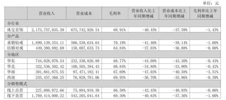 迪阿股份 2023 年各个品类营收均有所下滑,求婚对戒品类同比减少 41.46%,营收达到 16.99 亿元,占比营收比重达到 77.93%,营收下滑幅度也最大。