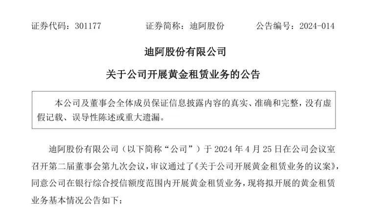 迪阿股份公告 2024 年拟开展黄金租赁交易