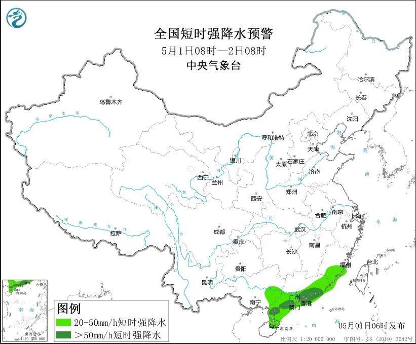 中央气象台 5 月 1 日 06 时继续发布暴雨蓝色预警:预计,5 月 1 日 08 时至 2 日 08 时,广西东南部、广东中南部、福建南部、海南岛东部、台湾岛大部等地部分地区有大到暴雨,其中,广东南部沿海局地有大暴雨(100~150 毫米)。上述部分地区伴有短时强降水(最大小时降雨量 20~50 毫米,局地可超过 70 毫米),局地有雷暴大风或冰雹等强对流天气。