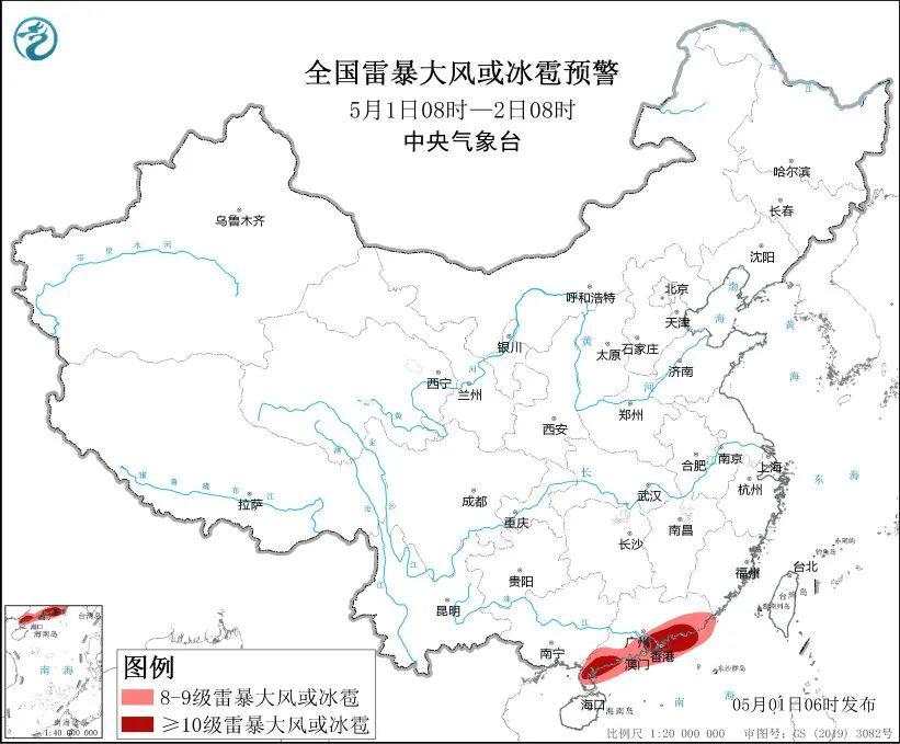 中央气象台 5 月 1 日 06 时发布强对流天气蓝色预警:预计 5 月 1 日 08 时至 2 日 08 时,广东南部及沿岸海域等地的部分地区将有 8-10 级雷暴大风或冰雹天气,最大风力 11 级以上;福建东南部、广西东部、广东中南部、海南岛东北部及华南沿岸海域等地的部分地区将有小时雨量大于 20 毫米的短时强降水天气,其中广东南部及沿岸海域等地局地最大小时雨量大于 50 毫米,最大可达 70 毫米以上。