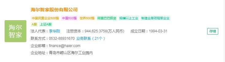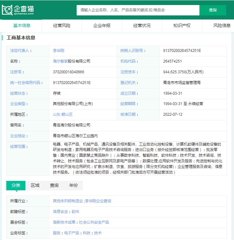 企查猫资料显示,海尔智家股份有限公司成立于 1994 年,是海尔集团公司旗下的一家上市公司,也是中国民营企业 500 强之一。该公司注册资金达 944,625.3758 万人民币