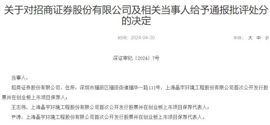 财联社 5 月 3 日讯(记者 肖斐歆)深交所开出罕见的 " 资格罚 ",事涉晶宇环境 IPO。发行人、公司实控人、保荐机构招商证券和相关保代涉事其中。