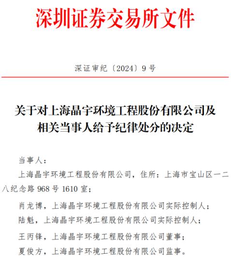 根据深交所披露的文件,因晶宇环境及其实际控制人、董事、监事刻意隐瞒与投资方签署的对赌协议,未在审核问询回复中如实说明主要关联方相关信息,在现场督导过程中未按照督导组的要求及时、完整提供相关材料,深交所对晶宇环境予以三年不接受其提交的发行上市申请文件的纪律处分并处公开谴责。