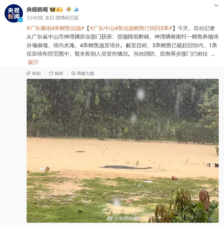 央视新闻报道,今天,总台记者从广东省中山市神湾镇农业部门获悉:受强降雨影响,神湾镇宥南村一鳄鱼养殖场外墙崩塌、场内水淹,4 条鳄鱼逃至场外。截至目前,3 条鳄鱼已被赶回池内,1 条在农场布控范围中,暂未收到人员受伤情况。当地消防、应急等多部门已前往开展全面排查,通知辖区居民不外出,目前情况安全可控。