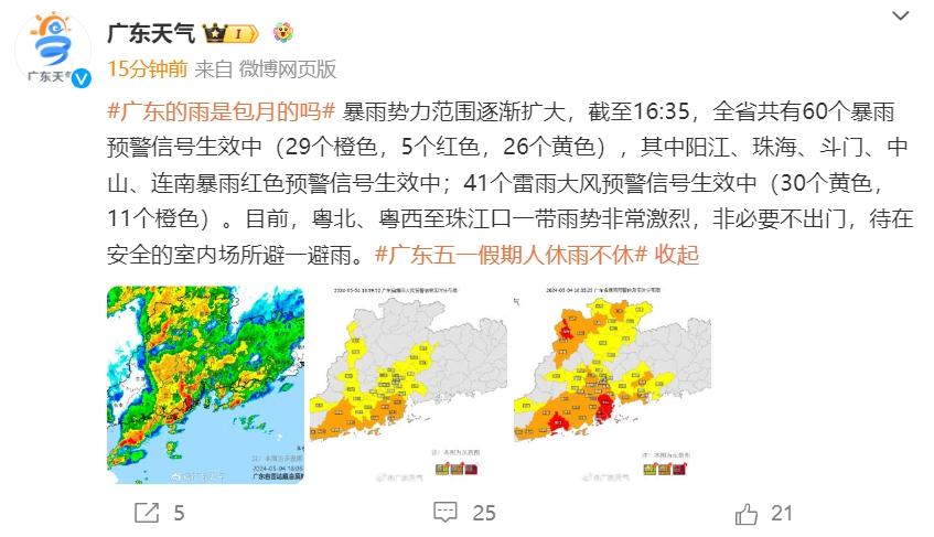 广东天气 5 月 4 日 16 时 41 分发文称,截至 16:35,全省共有 60 个暴雨预警信号生效中(29 个橙色,5 个红色,26 个黄色),其中阳江、珠海、斗门、中山、连南暴雨红色预警信号生效中;41 个雷雨大风预警信号生效中(30 个黄色,11 个橙色)。目前,粤北、粤西至珠江口一带雨势非常激烈,非必要不出门,待在安全的室内场所避一避雨。