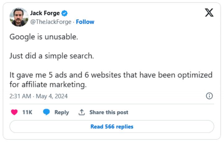 " 谷歌已经不能用了,只是做个简单搜索,它给了我 5 个广告和 6 个营销网站。" 一名科技工作者 5 月 4 日在 X 平台上发帖称,该推文获得了 1 万多人的点赞。