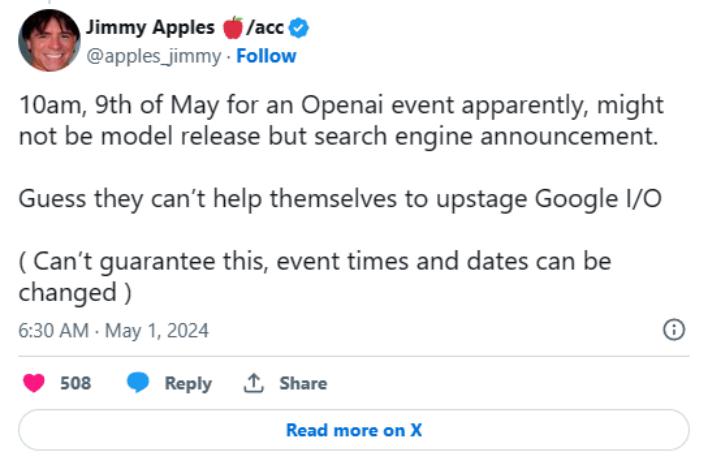 据 X 用户名为 Jimmy Apples 的人工智能领域的知名爆料者预测,OpenAI 将在 5 月 9 日发布新产品。而值得注意的是,谷歌 I/O 开发者大会将于 5 月 14 日召开,抢在这场盛会之前发布搜索产品,OpenAI 大有 " 先发制人 " 之意。谷歌的麻烦是否要来了?