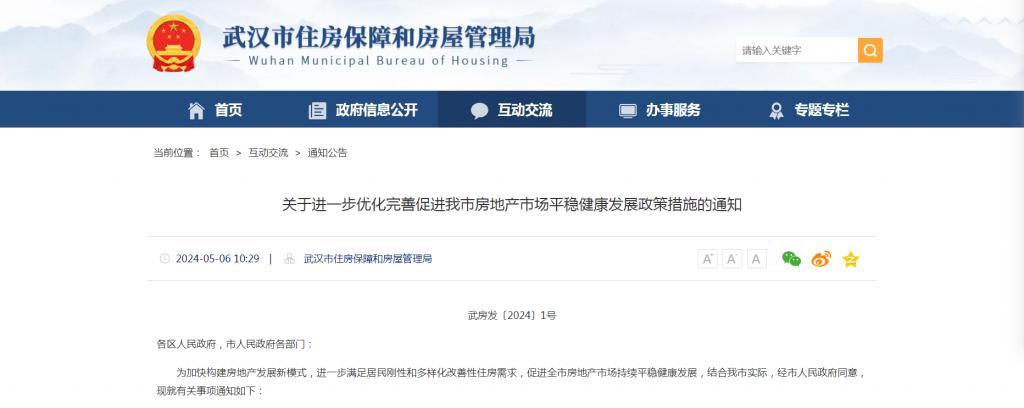 5 月 6 日,武汉市住房保障和房屋管理局官网发布《关于进一步优化完善促进我市房地产市场平稳健康发展政策措施的通知》。《通知》提出,优化住房公积金个人住房贷款套数认定标准,实行 " 认房不认首次贷 "。阶段性调整异地贷款使用条件,取消住房公积金贷款户籍地和缴存地限制。