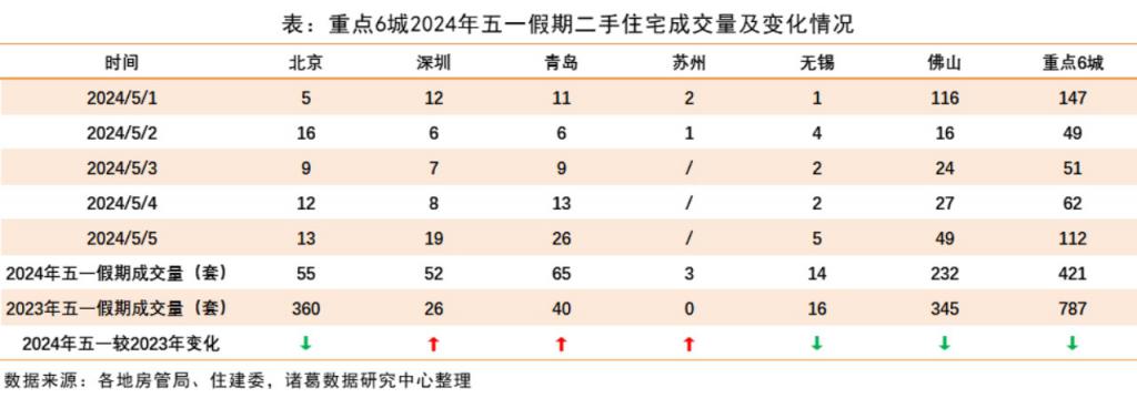 二手房整体成交走势与新房一致,整体成交数据仍在下降。根据诸葛研究院,今年 " 五一 " 期间,北京、深圳、青岛、苏州、无锡、佛山等重点 6 城二手住宅成交 421 套,同比去年下降 46.51%。