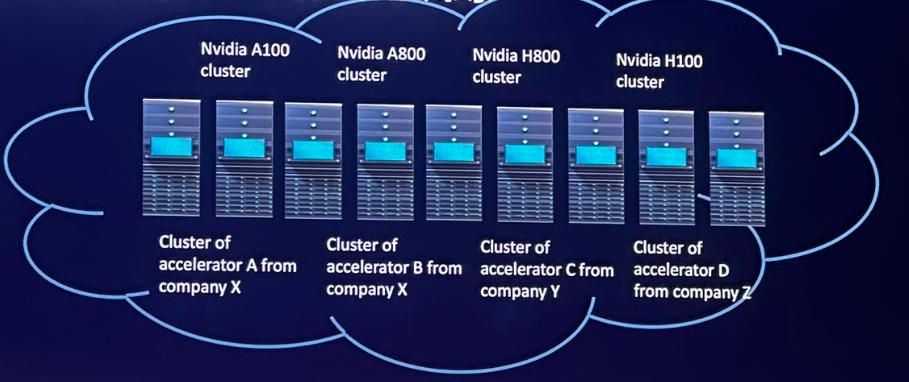 不少智算中心,使用不一样的 AI 芯片服务器组成异构集群合池训练,共同完成一个大模型训练。尤其是此前 GPU 紧缺的情况下,一些数据中心、智算中心在不同时期,购买了不同的 GPU,形成了不同类型、不同版本的异构集群。