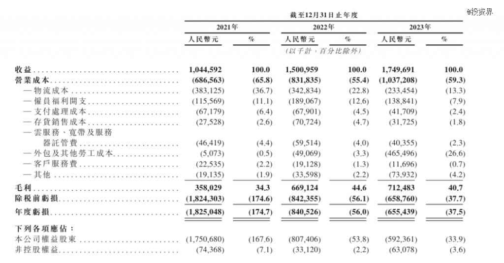 招股书显示,多点 Dmall 在 2021 年、2022 年、2023 年营收分别为 10.45 亿元、15.01 亿元、17.5 亿元;毛利分别为 3.58 亿元、6.69 亿元、7.12 亿元;毛利率分别为 34.3%、44.6%、40.7%。但亏损仍无法回避:过去三年 Dmall 亏损分别为 18.25 亿元、8.4 亿元、6.55 亿元,经调整亏损分别为 9.59 亿元、2.96 亿元、1.4 亿元。