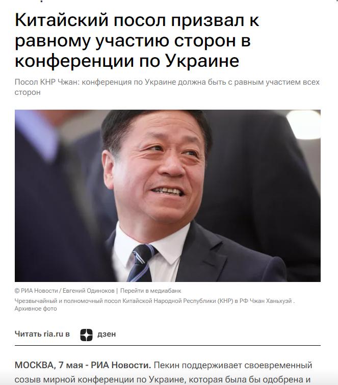 2024 年 5 月 7 日,张汉晖大使就中俄高层交往、经贸合作、乌克兰危机、中俄文化年等问题接受 " 今日俄罗斯 " 通讯社书面采访。采访全文如下: