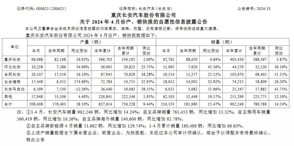 日前,长安汽车公布 2024 年 4 月销量为 210133 辆,其中长安系中国品牌乘用车销量为 123118 辆,长安汽车中国品牌新能源销量 51682 辆,同比增长 129.7%;中国品牌海外销量 31649 辆,同比增长 93.2%。