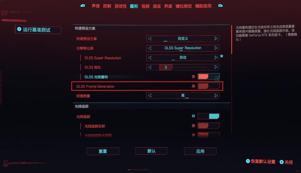 具体的做法,以《 赛博朋克 2077 》为例,设置里有一个只有 40 系显卡才能开启的 DLSS Frame Generatation 帧生成功能。