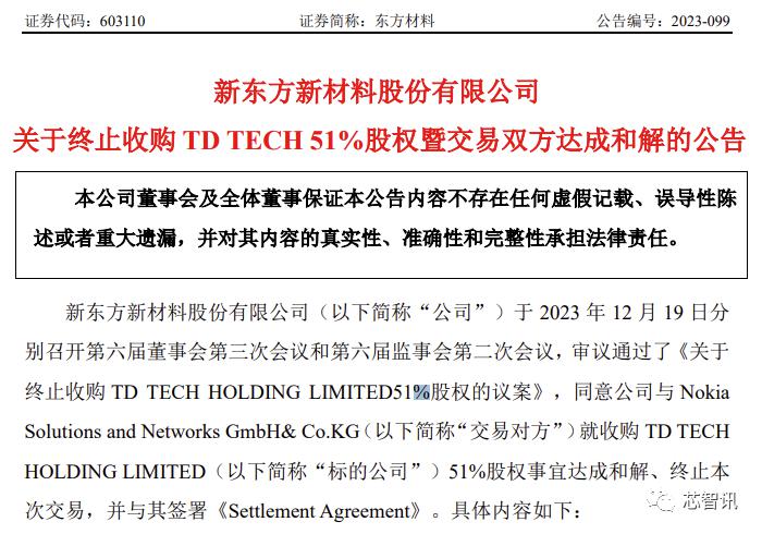 日前,东方材料发布公告称,该公司审议通过了《关于终止收购 TD TECH HOLDING LIMITED 51% 股权的议案》,同意公司与 Nokia Solutions and Networks GmbH& Co.KG(以下简称 " 诺基亚 ")就收购 TD TECH HOLDING LIMITED(以下简称 "TD TECH")51% 股权事宜达成和解、终止本次交易,并与其签署《Settlement Agreement》。