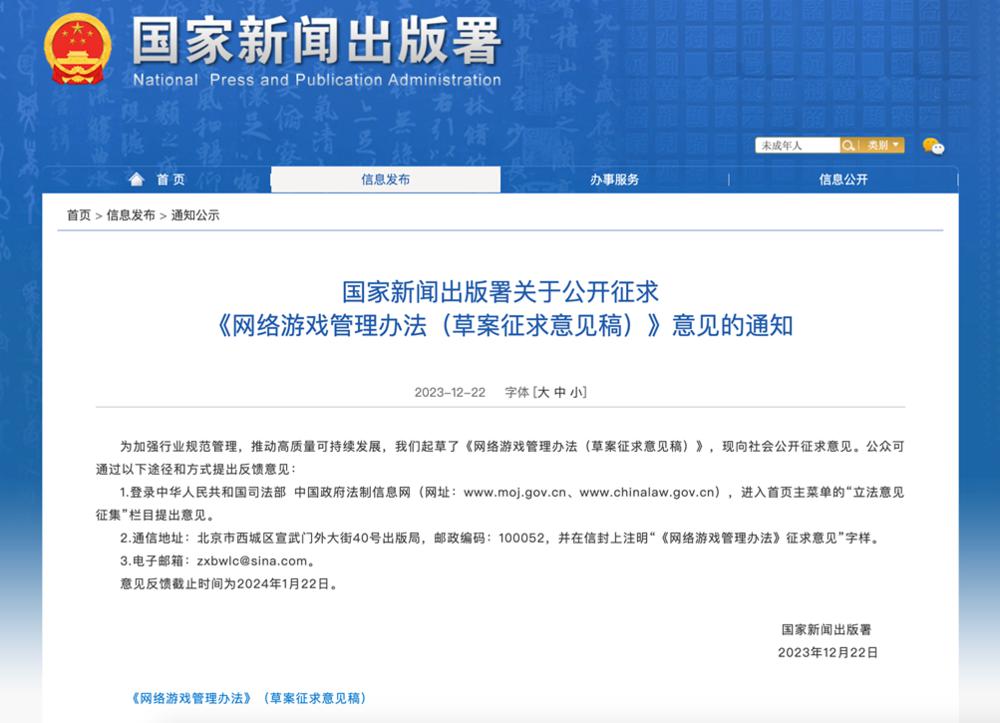2023 年 12 月 22 日,国家新闻出版署发布通知,公开征求《网络游戏管理办法(草案征求意见稿)》意见,下称《意见》。国家新闻出版署表示,这是为加强行业规范管理,推动高质量可持续发展。