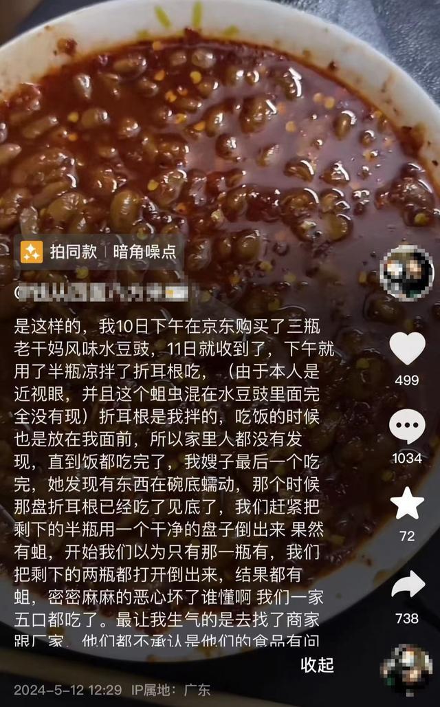 据网友发布视频,其称,5 月 10 日在网购平台下单购买了 3 瓶老干妈风味水豆豉,11 日收到货后,下午用半瓶拌了折耳根吃,吃完后其家人发现有虫子在碗底蠕动,随后将另外半瓶倒到干净盘子中,也发现有蛆虫。之后,将剩余的两瓶打开倒出,结果发现 3 瓶都有蛆。" 找了商家跟厂家,他们都不承认是食品有问题。"