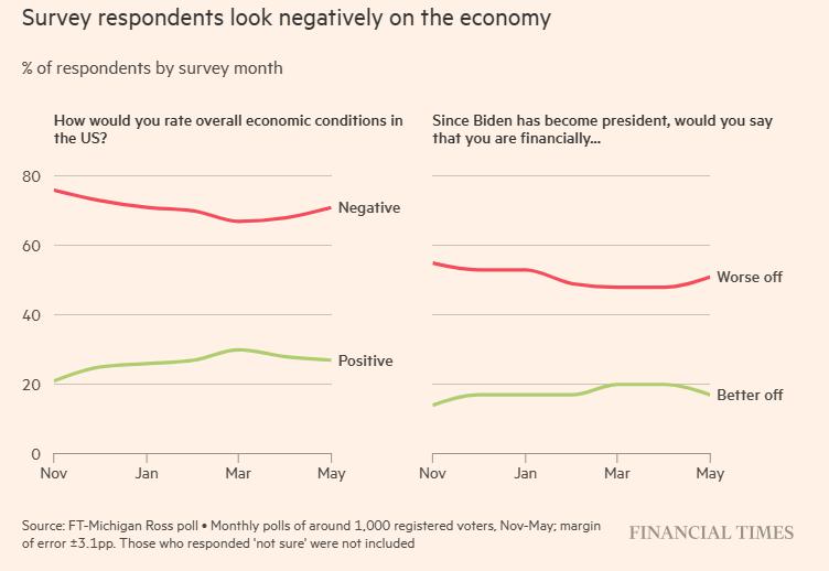 根据密西根大学罗斯商学院组织的一项民意调查发现,拜登在经济方面的支持率虽然在 4 月份曾有过略微上升,不过如今又回落到 " 令白宫官员沮丧的 " 水平。这项调查于 5 月 2 日至 6 日进行。