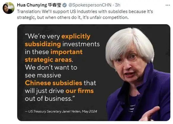 近期,美国财政部长耶伦接受美国电台节目《Marketplace》采访时,再度炒作中国在电动汽车、太阳能等领域存在所谓的 " 产能过剩 ",被主持人质疑美政府也在这些领域提供巨额补贴。对此,中国外交部部长助理、发言人华春莹发文," 翻译 " 耶伦给出的解释,一语道破美国的双标言行。